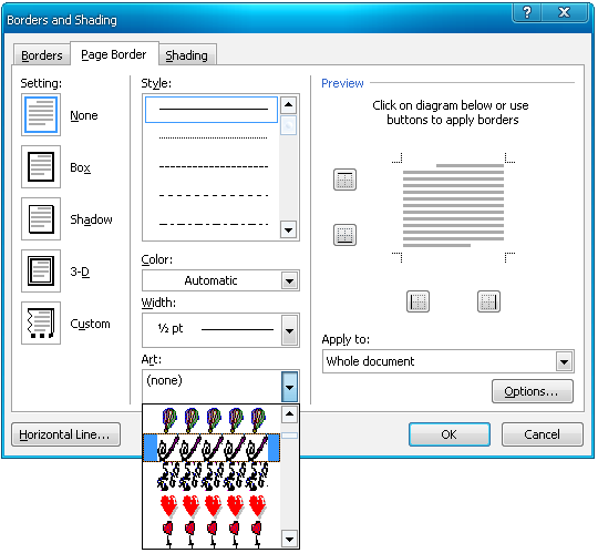 Layout>Page Borders, kemudian akan tampil kotak dialog Borders